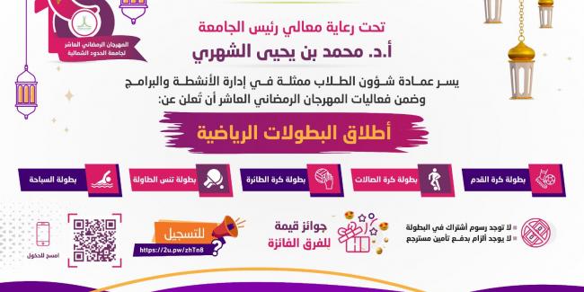 تحت رعاية معالي رئيس الجامعة •• أ.د.محمد بن يحيى الشهري •• يسر عمادة شؤون الطلاب ممثلة في إدارة الأنشطة والبرامج أن تعلن عن أنطلاق البطولات الرياضية ضمن فعاليات المهرجان